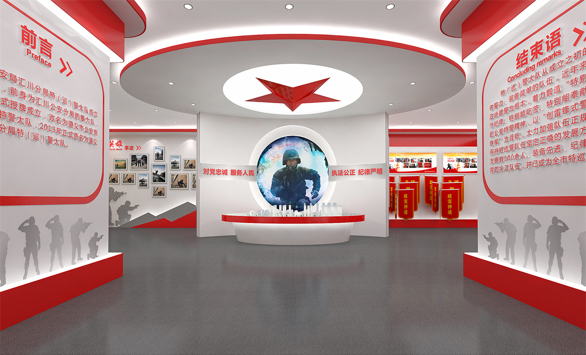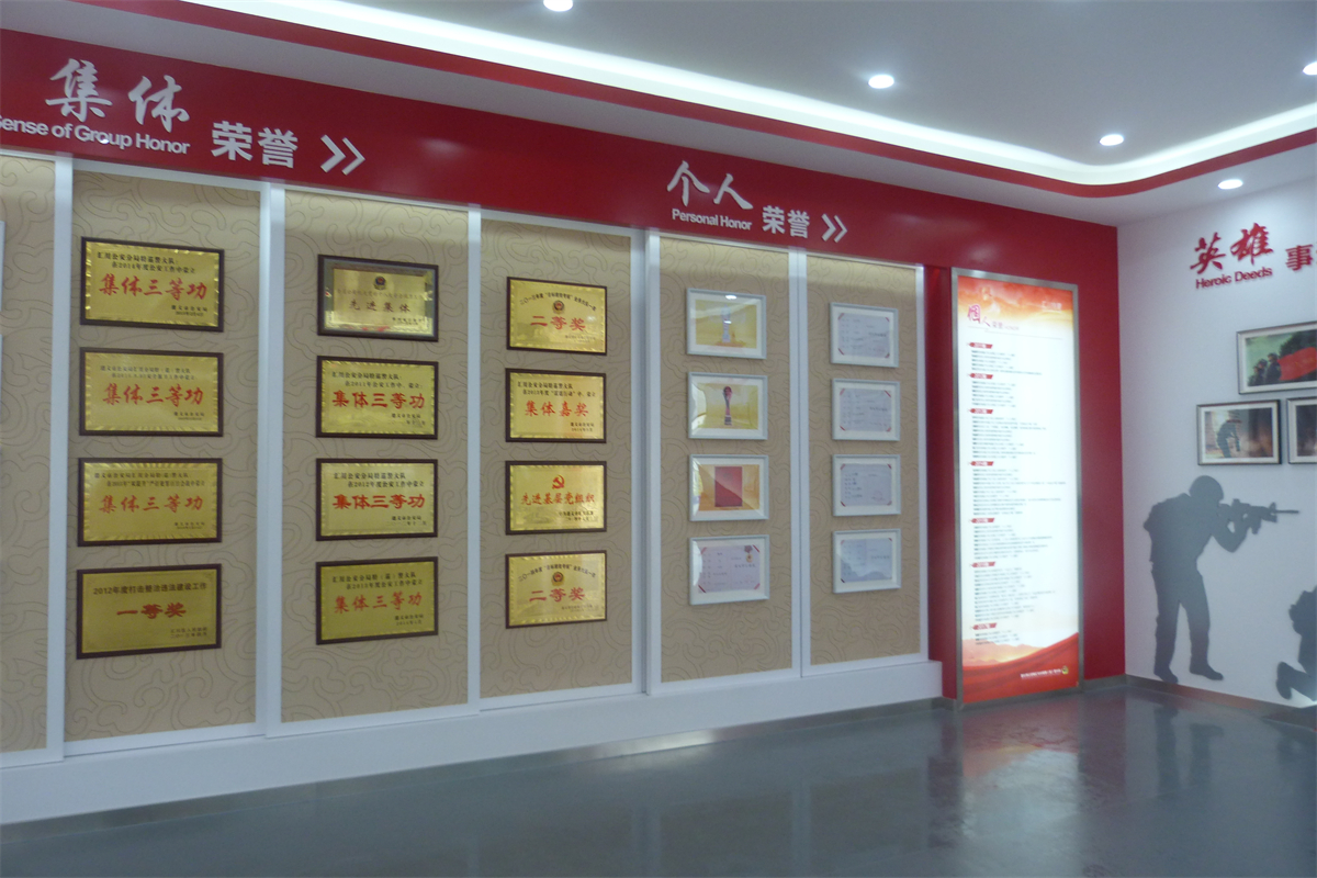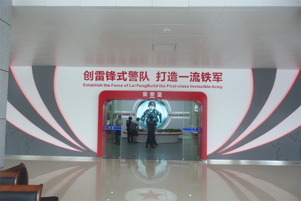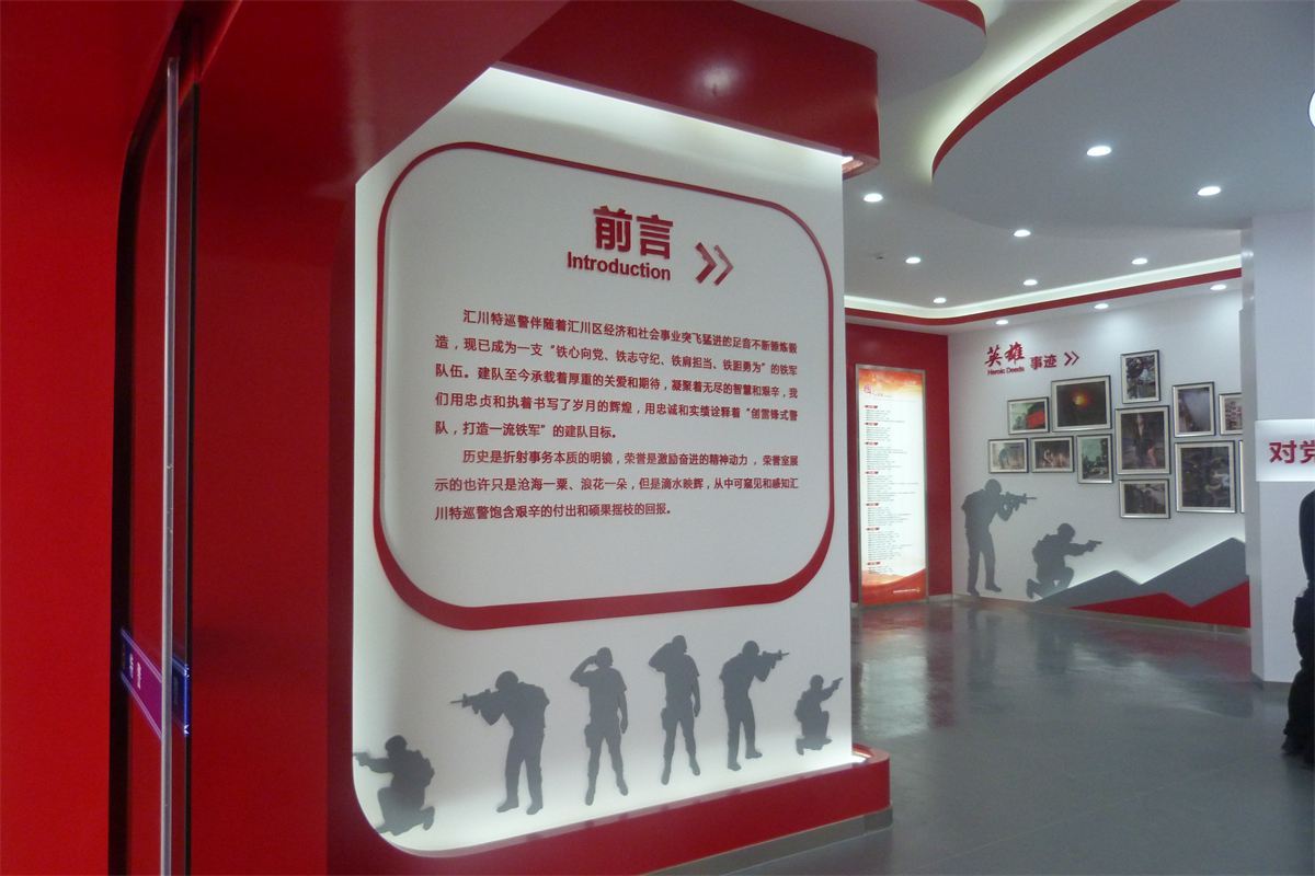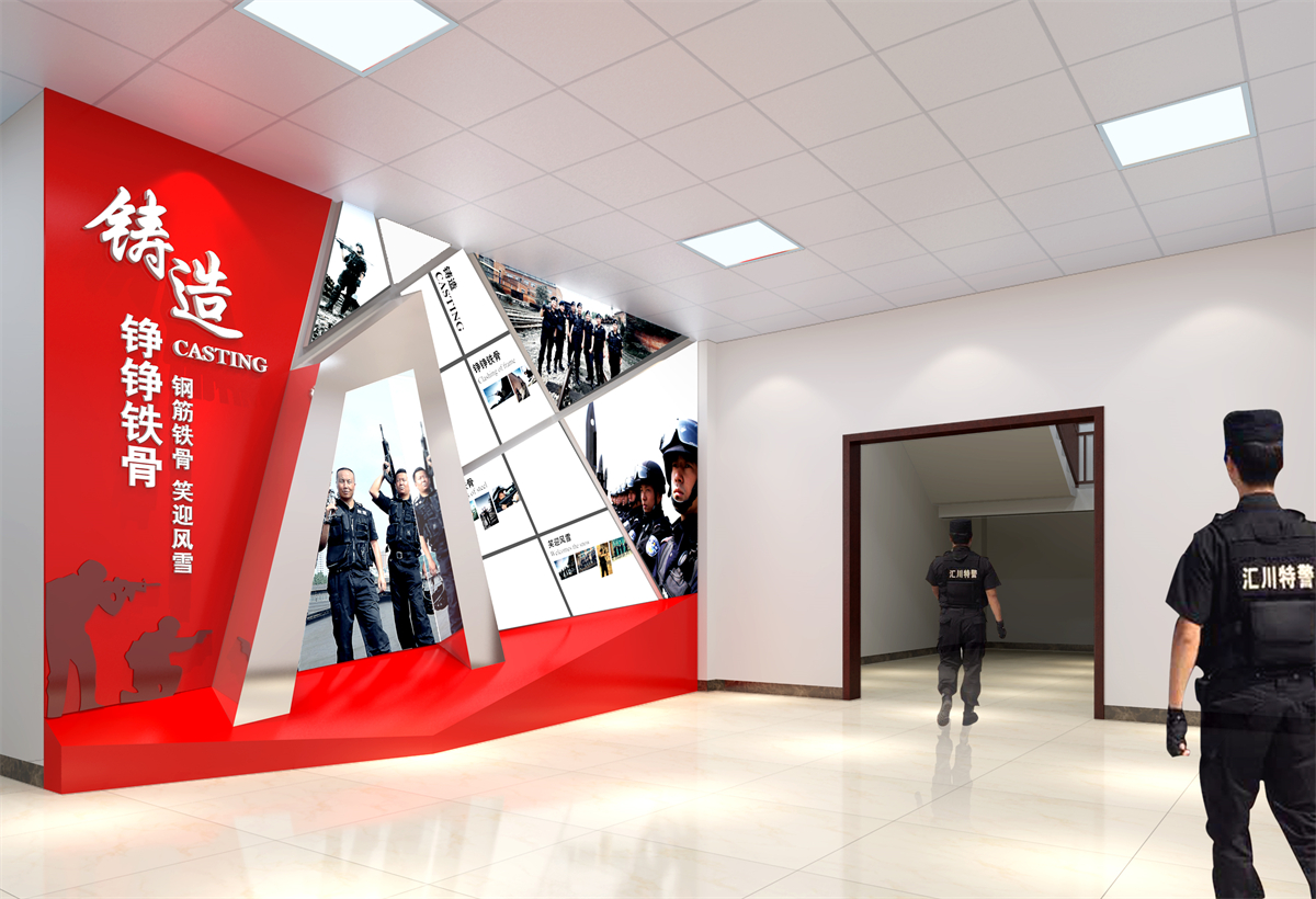 在项目建设上,以“创雷锋式警队,打造一流铁军”为核心精神,通过“横向全面、纵向深入”相结合的形式,整体展现汇川特警的警队文化,体现娄山精神传承至今的当代风采,呈现出特警大队这支国之利刃(楼体外口号标语),传承娄山精神,创雷锋式警队,打造一流铁军(两侧文化墙),守护大美汇川(荣誉陈列室),挥洒青春热血的景象(训练场)。